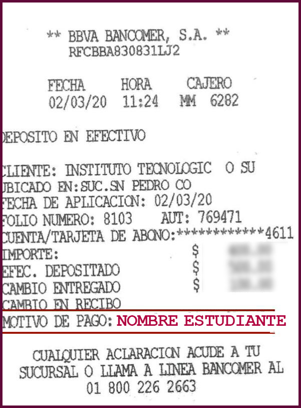 Una vez realizado el depósito bancario es necesario que inmediatamente le tomes una fotografía al comprobante y resguardes el original en un lugar seguro para garantizar que no se borre la información de éste, ya que en los próximos días se te notificará en qué fecha deberás entregarlo personalmente en las instalaciones de nuestro Instituto.Una vez concluido los pasos anteriores, recibirás en los próximos días a través de tu correo institucional la siguiente información: